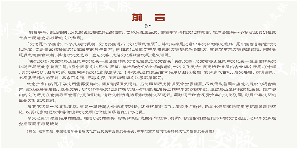 “全国碑拓文化巡展”组委会负责人、中国地名学会名胜文化专业委员会会长、中国动画促进会碑拓文化工作委员会主任李忠信先生在前言里道出了此次全国巡展的深远意义:“蓟壤苍苍,燕山泱泱,历史的长风拂过房山的石刻,也将从这里出发,带着中华碑拓文化的厚重,走向全国每一个角落,让我们在此开启一段与金石对话的文化旅程”。